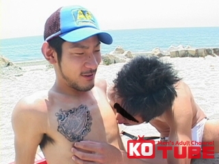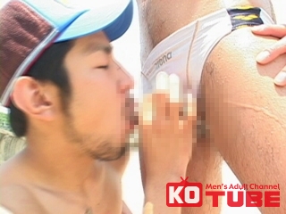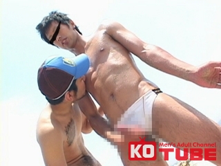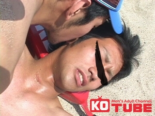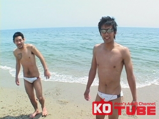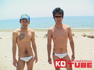 「青い海最高っす!」初登場の三井英芳!白く輝くエロ競パンをくい込ませ三井英芳と増尾忠司がモデル同士の絡みに挑戦! 『NAKED OUT 4』より