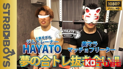 人気モデルジムトレーナーHAYATO22歳とマッチョフリーター25歳の筋肉初共演作品!インタビューも早々に合トレ開始!懸垂、ベンチプレス、腹筋ローラーと次々とメニューをこなします。HAYATOのガチトレーナー講座付き!笑。腹筋ローラーはまじで2人ともすごい。さすがのマッチョ。経験者ならわかりますが直立の状態から体勢を水平まで伸ばしまた戻る。おぉ!!って感じです笑。合トレを終えたら、ようやくキスから始まりお互いのウエアを脱がし股間を弄り...そしてついにしゃぶりあい。HAYATOは初フェラ挑戦だし相手モデルもぎこちない感じが、またそれが初々しくていいですね。その後濃厚キスに69、相互ローション攻めをし、最後はマッチョフリーターはまさかの咥えイキ!HAYATOはマッチョフリーターの顔にザーメンぶちまけます!